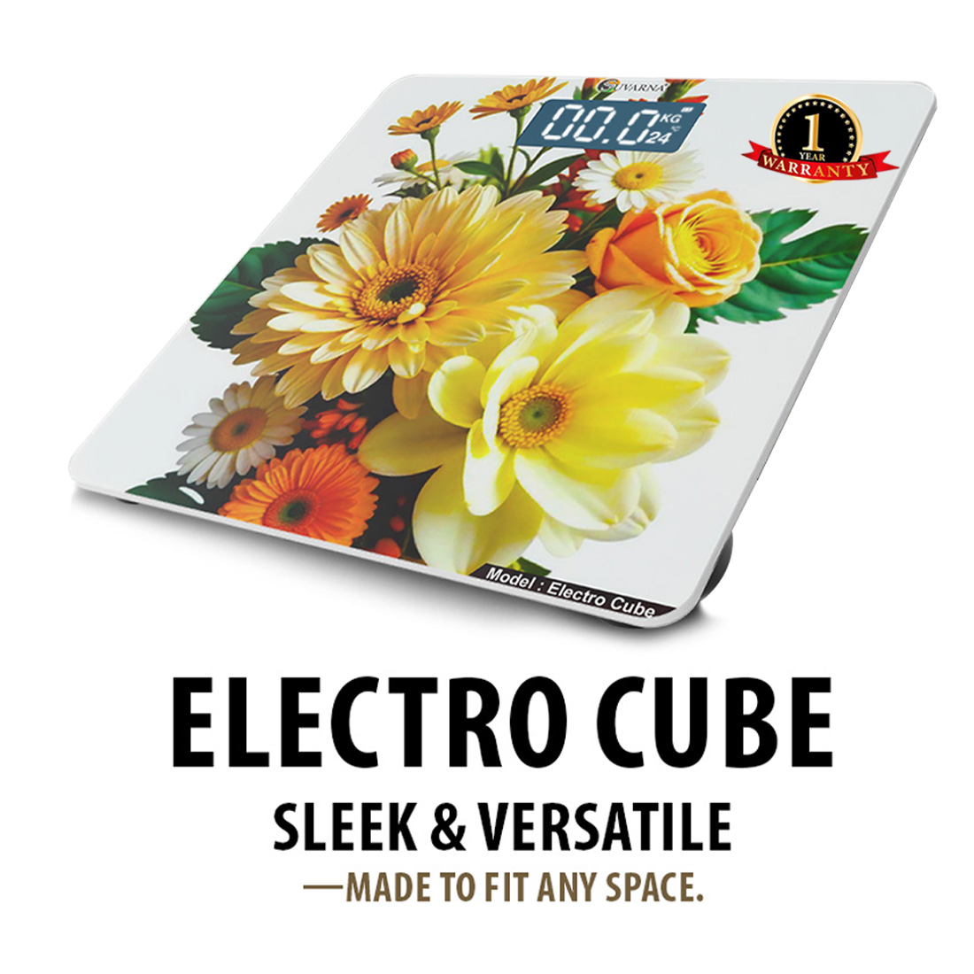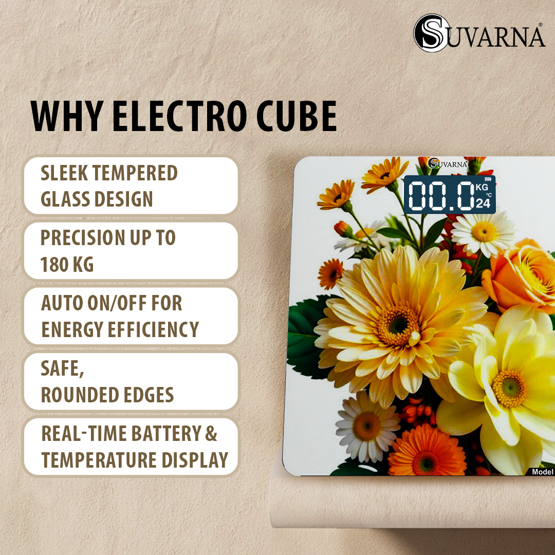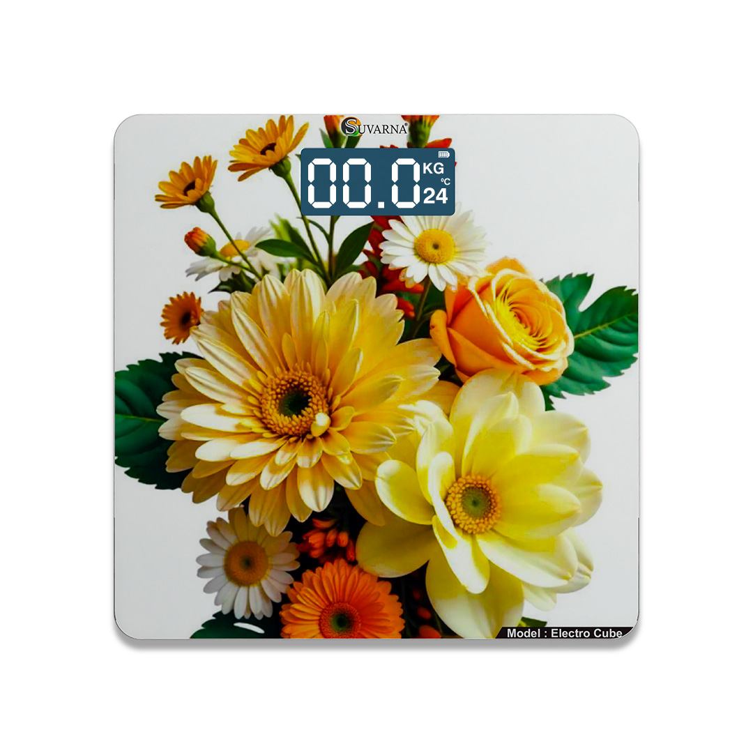 Bring elegance and accuracy together with the Suvarna Electro Cube Digital Weighing Scale, designed with a beautiful floral print and toughened glass platform. This digital body weight machine is perfect for home, gym, or bathroom use, offering both style and precision in one compact design. Equipped with high-precision sensors, it provides accurate readings every time. The large LCD backlit display ensures easy readability, while the auto on/off function saves power and enhances convenience. Made from 6mm tempered glass, it offers durability and safety for daily use. The Suvarna Electro Cube Scale features low battery and overload indicators, ensuring long-lasting performance. Whether you’re tracking your fitness progress or simply checking your weight, this digital personal weighing scale delivers consistent and reliable results.igital weight machine for home, electronic weighing scale, body weight machine, personal weight scale, digital weighing machine 180 kg, bathroom scale glass, fitness weight scale, floral digital scale.digital weighing scale for body weight | glass weight machine for bathroom | personal digital scale | home gym weight machine | floral design weight machine | best digital weight machine under 1000 | electronic body weight scale | automatic weighing machine | LCD display weighing scale | tempered glass digital scale